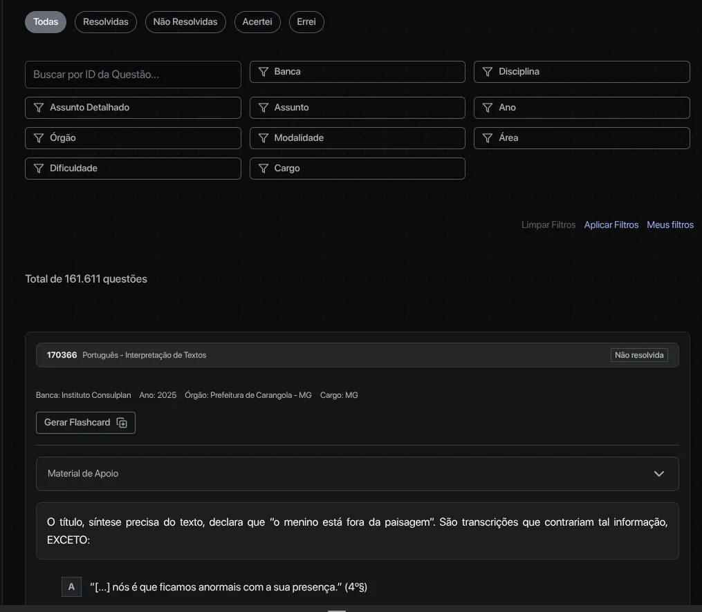Nosso lema é foco total em concursos. Por isso, treinamos modelos específicos para cada banca e área do conhecimento. Isso garante que as questões geradas sejam altamente relevantes e alinhadas com o que você encontrará na prova.