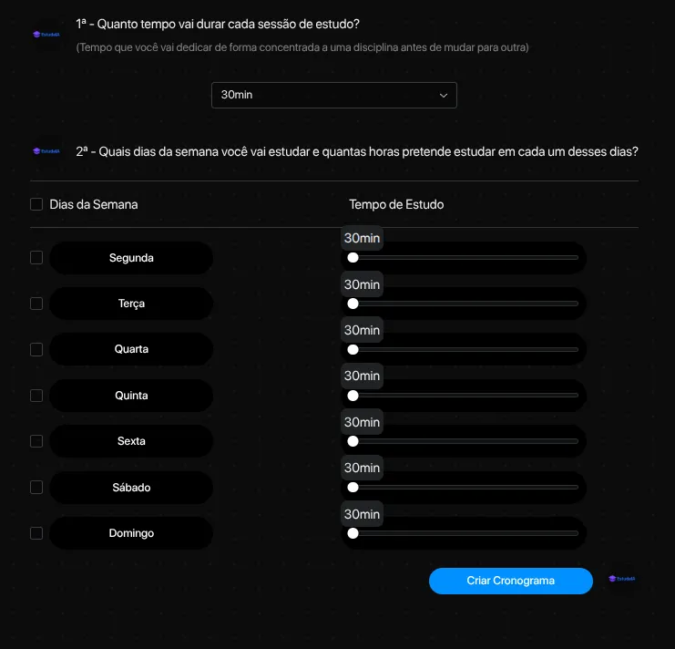 Aqui levamos em consideração sua rotina, peso de cada matéria no seu edital, tópicos recorrentes, dias até sua prova, dificuldade em cada matéria e muito mais.