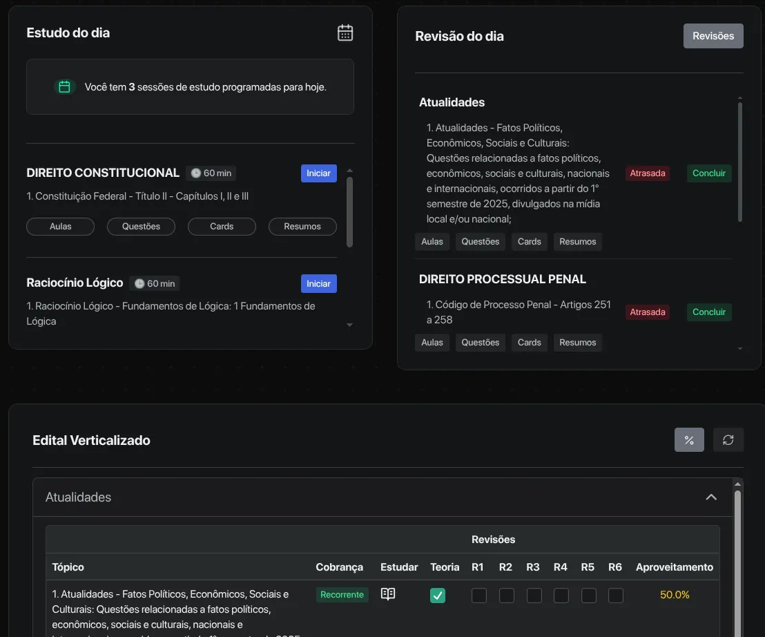 Saiba exatamente o que estudar e revisar até o dia da sua prova com nossa IA. Algoritmos com base em ciência, levamos em consideração suas dificuldades e muito mais. Edital vericalizado interativo, acompanhe seu desempenho, revisões. Tenha organização total do seu ciclo e com IA.
