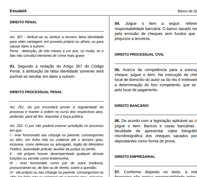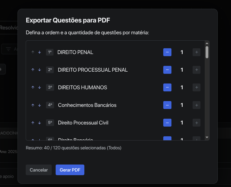 Exporte em Formato de PDF, estilo simulado organizado. Sim, além de resolver as questões diretamente na plataforma, você pode exportar todo o conteúdo gerado em um arquivo PDF bem organizado, pronto para impressão ou estudo offline. Tenha tudo que você precisa em um só lugar!