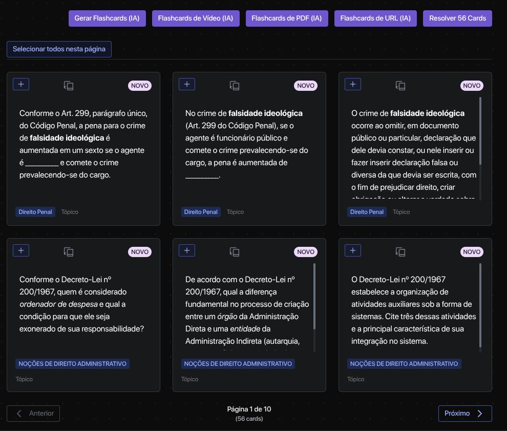 Geração de Flashcards (PDF, Texto, YouTube, Web)