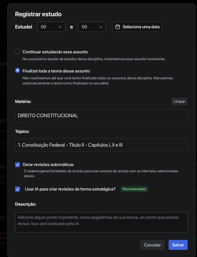 Registre seu estudo diário e receba revisões inteligentes baseadas no que você estudou. Nossa IA analisa seu progresso e sugere revisões personalizadas para maximizar sua retenção de informações. Até sua prova! chega de revisar por 1,7,15 dias. Organização é a chave dos estudos!
