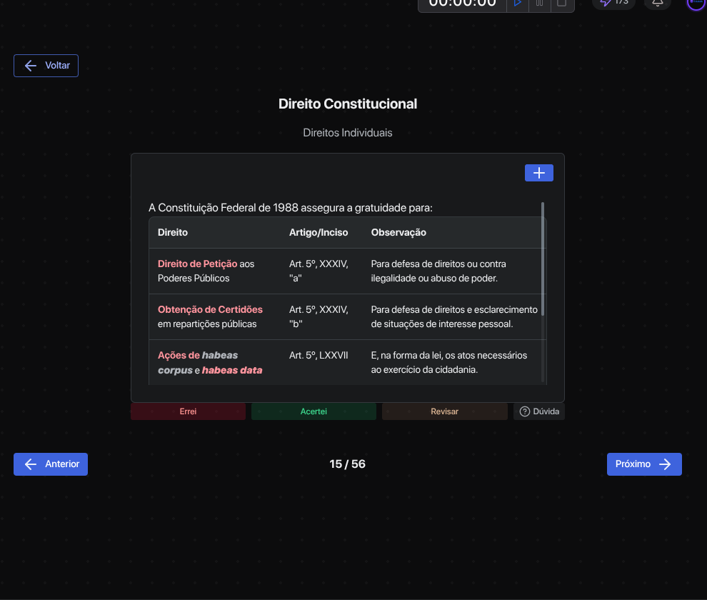 Flashcards diretos ao ponto, com visual que faz você reter o contéudo. Nada de poluição visual, apenas o que você precisa para revisar de forma rápida e eficiente. Tudo organizado!